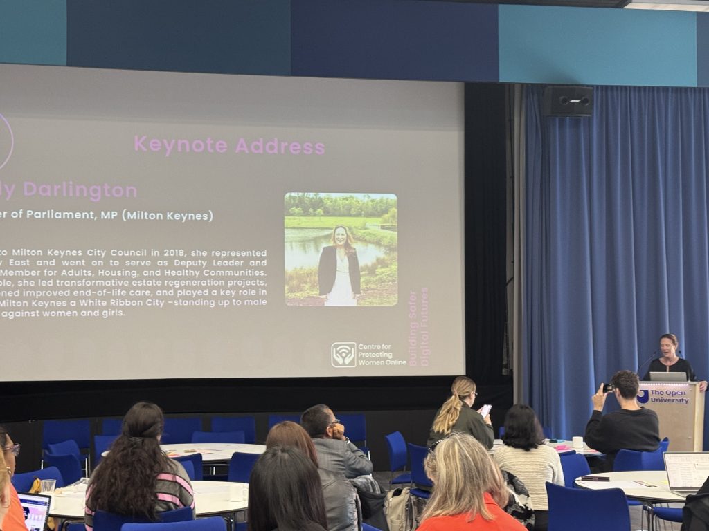 The morning began with an inspiring keynote address from Emily Darlington, MP for Milton Keynes Central, who shared personal reflections and underscored the urgent need to tackle violence against women and girls (VAWG) both online and offline. Her message set a strong tone for the day, emphasising the role that technology, policy, and community must play in creating safer digital spaces for everyone.